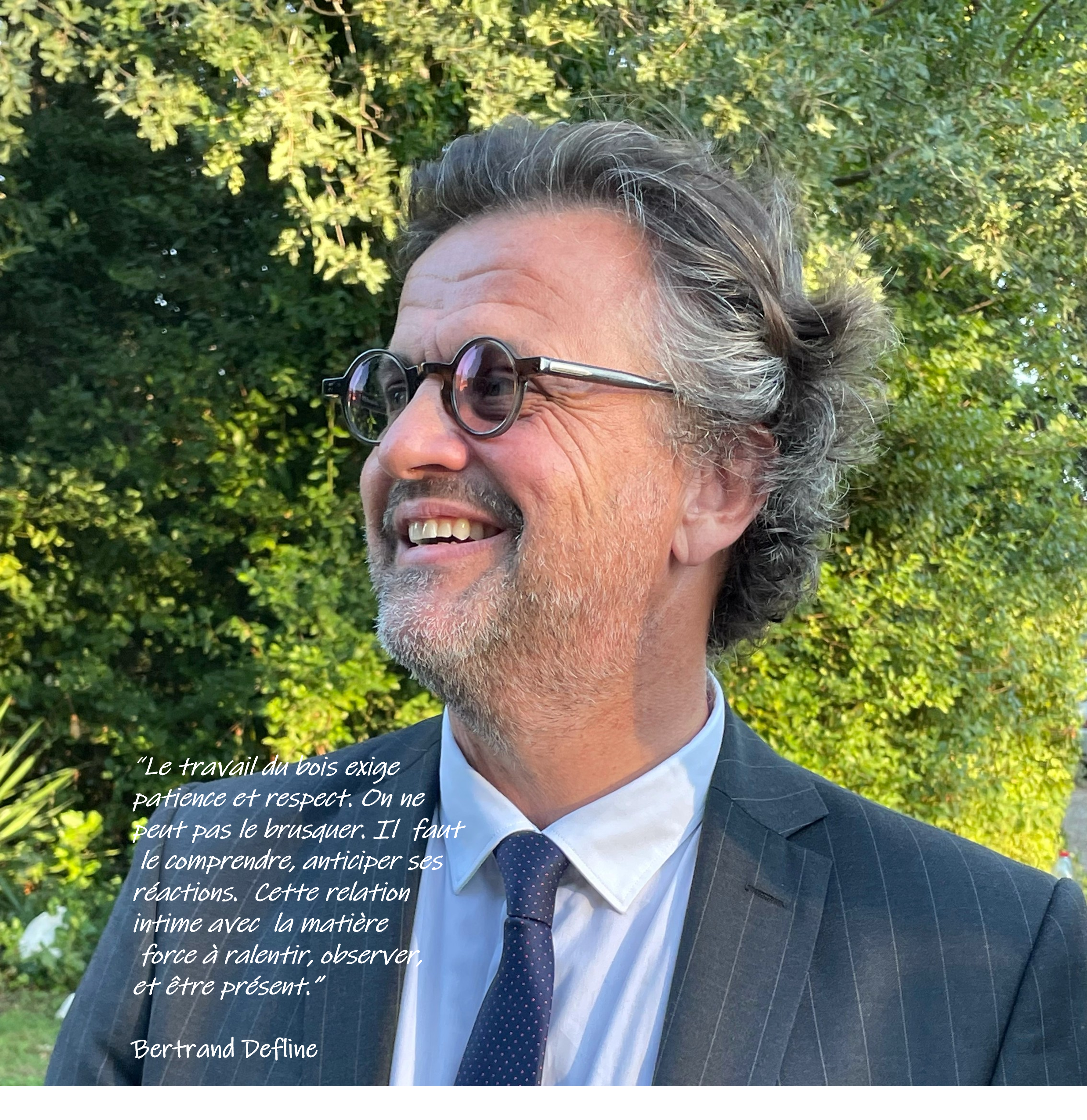 Passionné par l'ébénisterie et l'origine de sa matière première, l'arbre, il embrasse l'idée qu'en le transformant, il ne disparait pas, mais continue de s'exprimer dans une seconde vie.