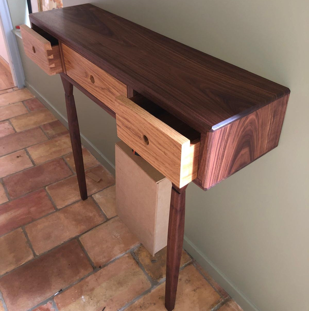 En appui sur un mur, cette petite console est en noyer noir massif et chêne. 3 tiroirs, assemblages traditionnels en queues d'aronde.