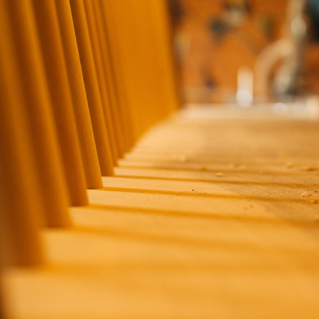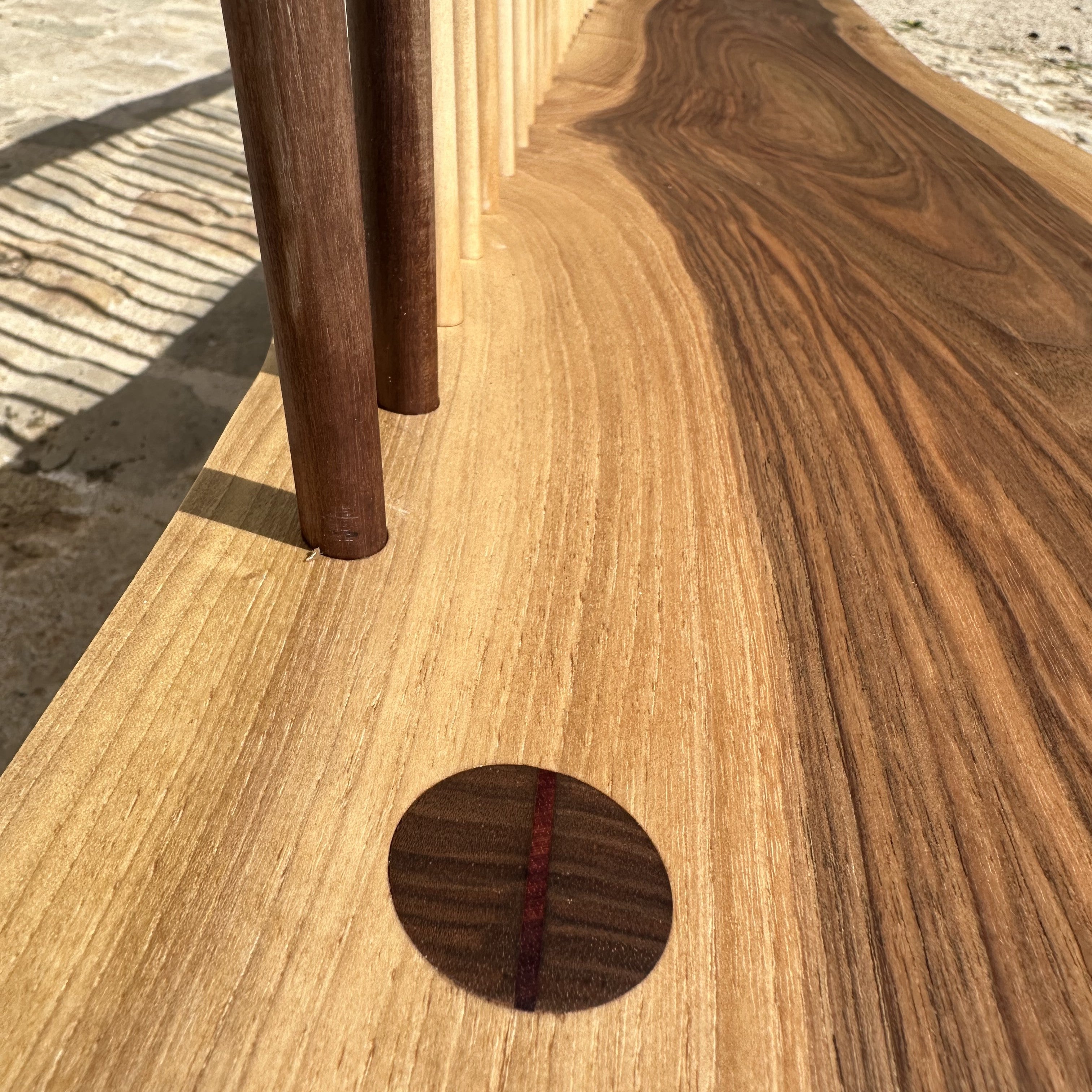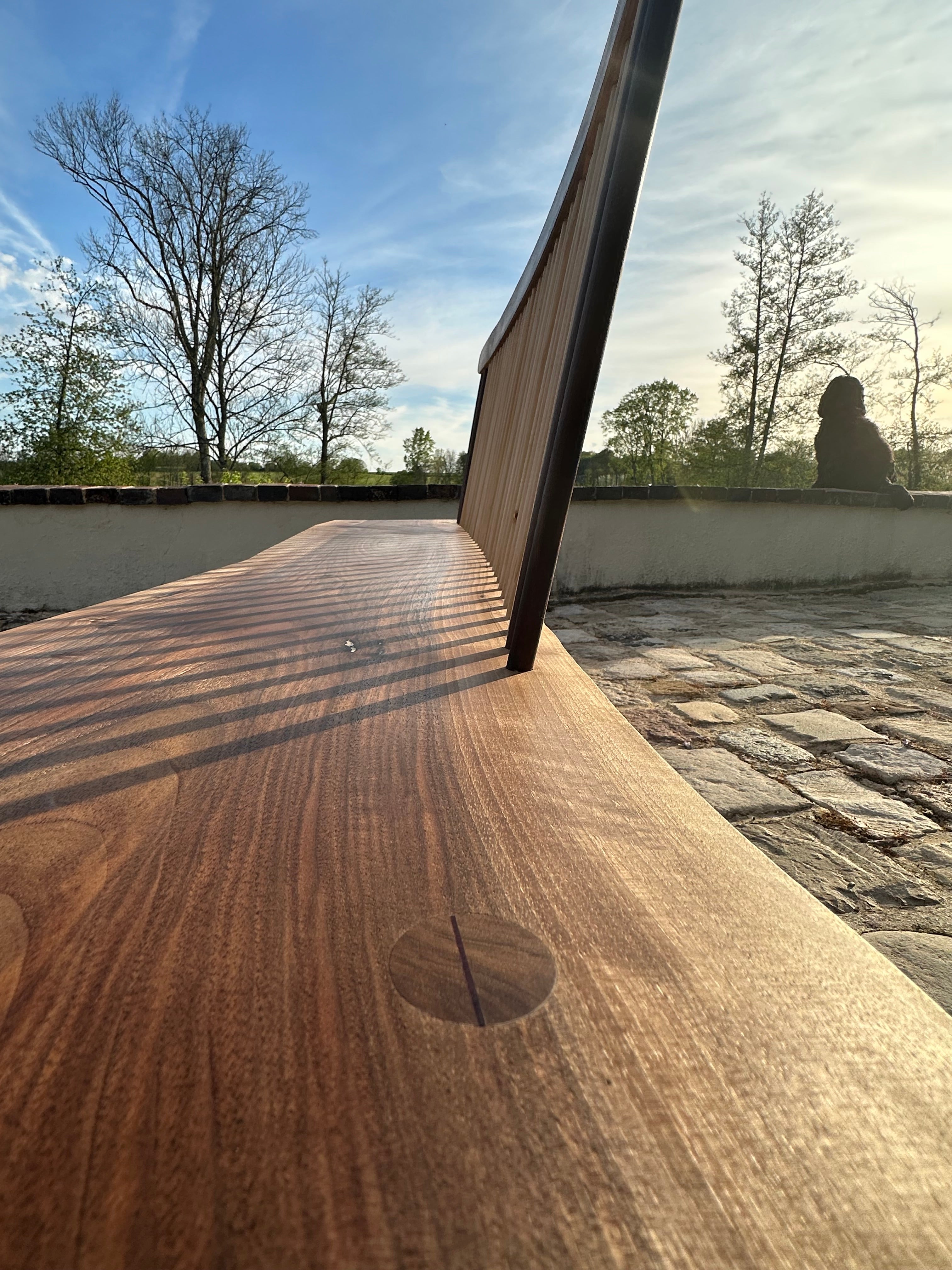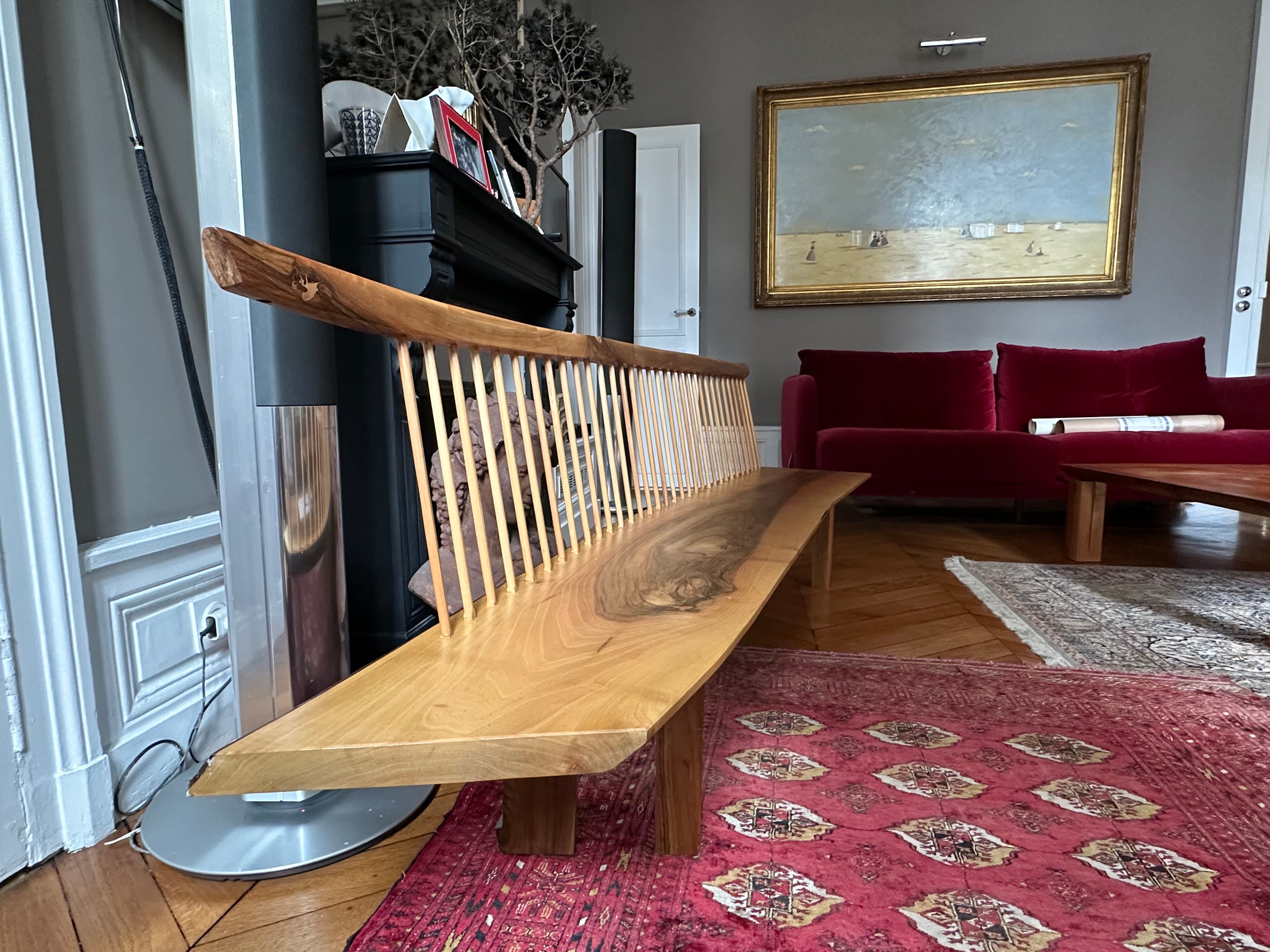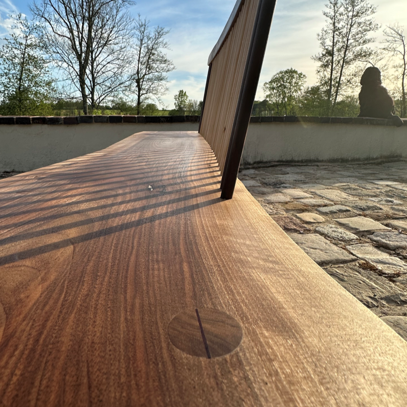 Banc en noyer noir ou royal massif. Barreaux de dossiers en acacia et noyer, pieds de section rectangulaire, ou tournés et traversants.