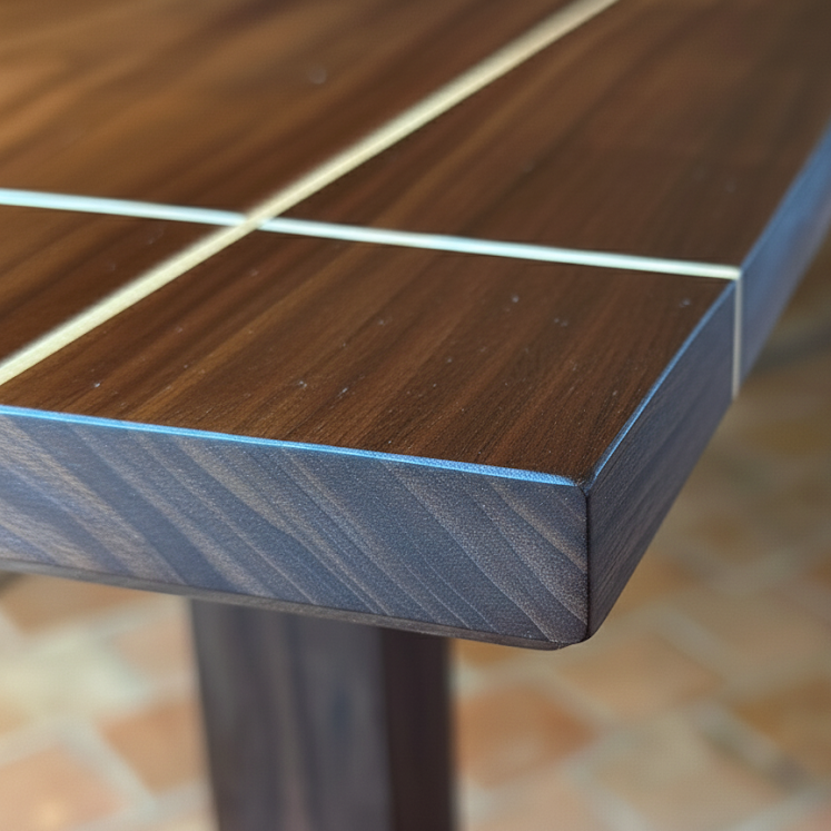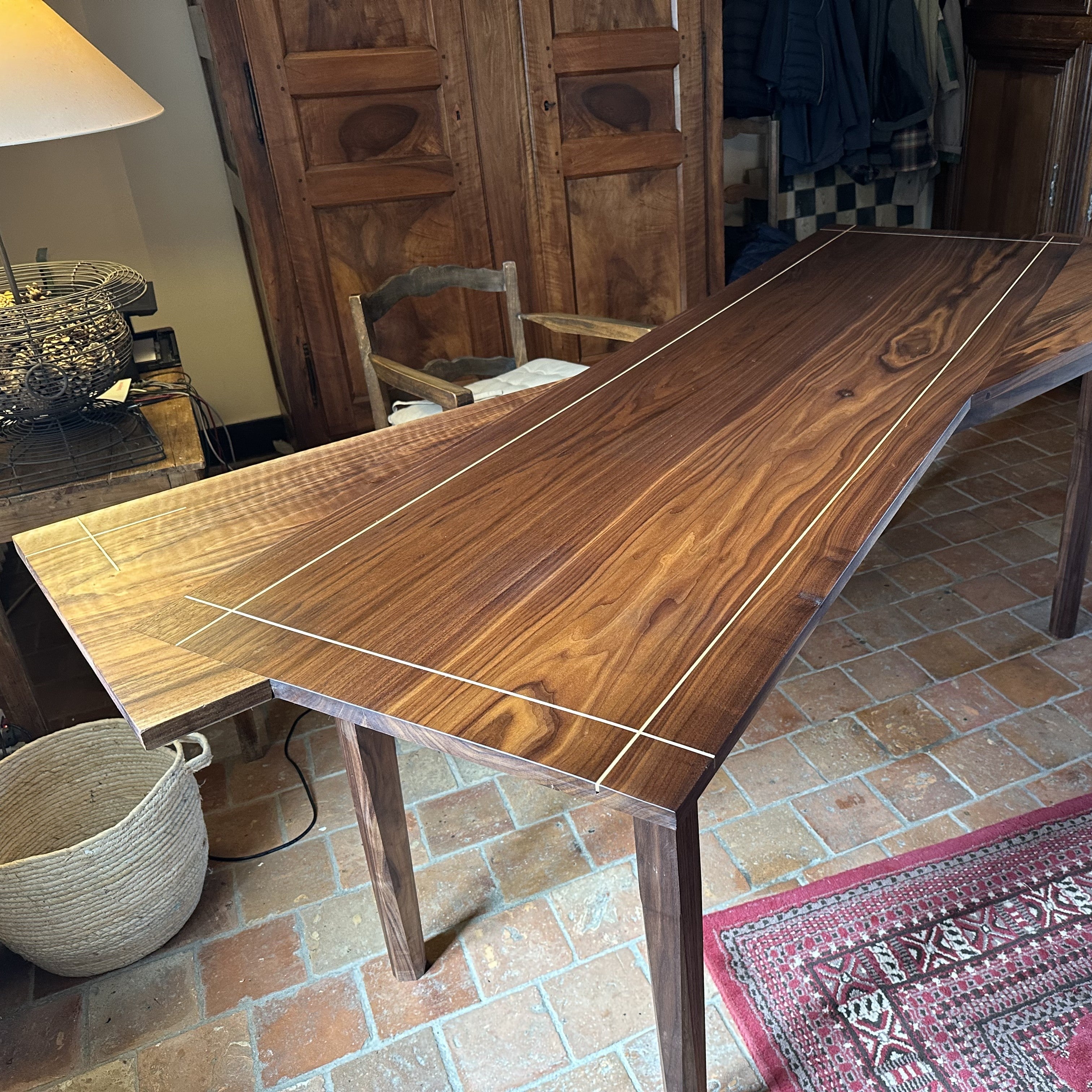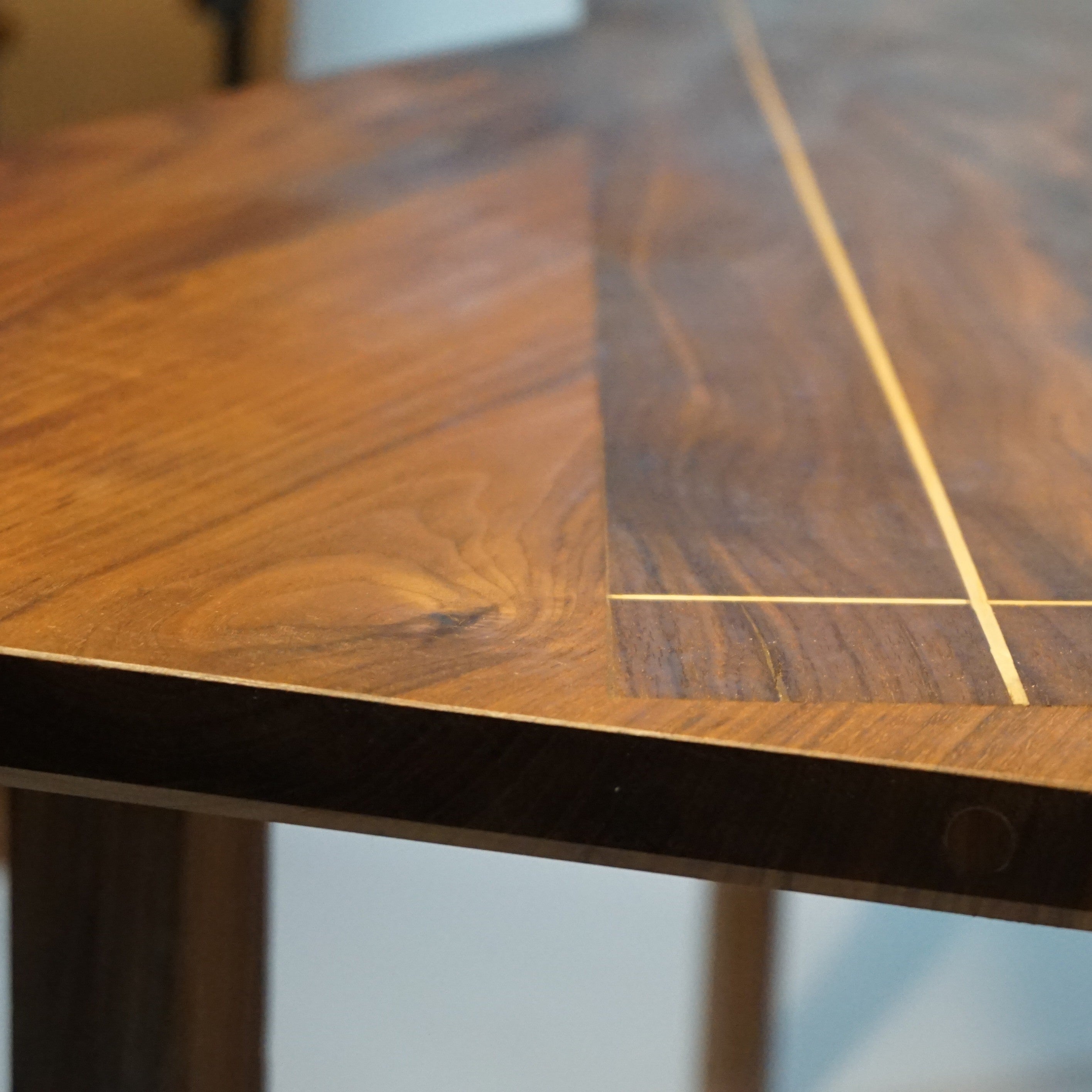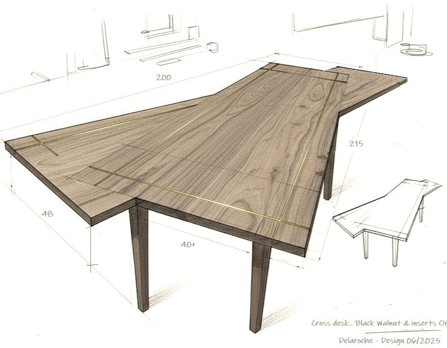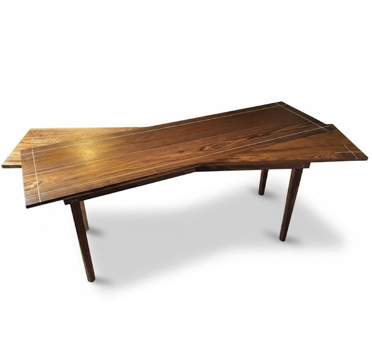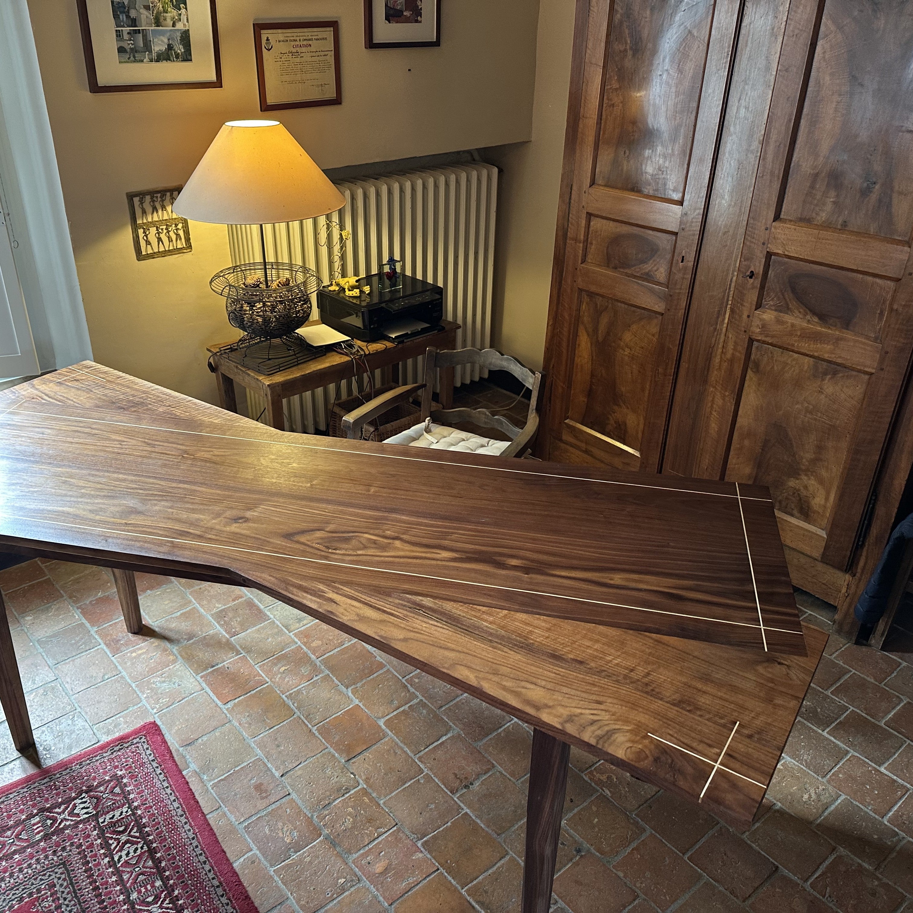 Double plateau croisé pour une esthétique remarquable, avec incrustation de filet de bois d'orme. Petit tiroir secret sous plateau.