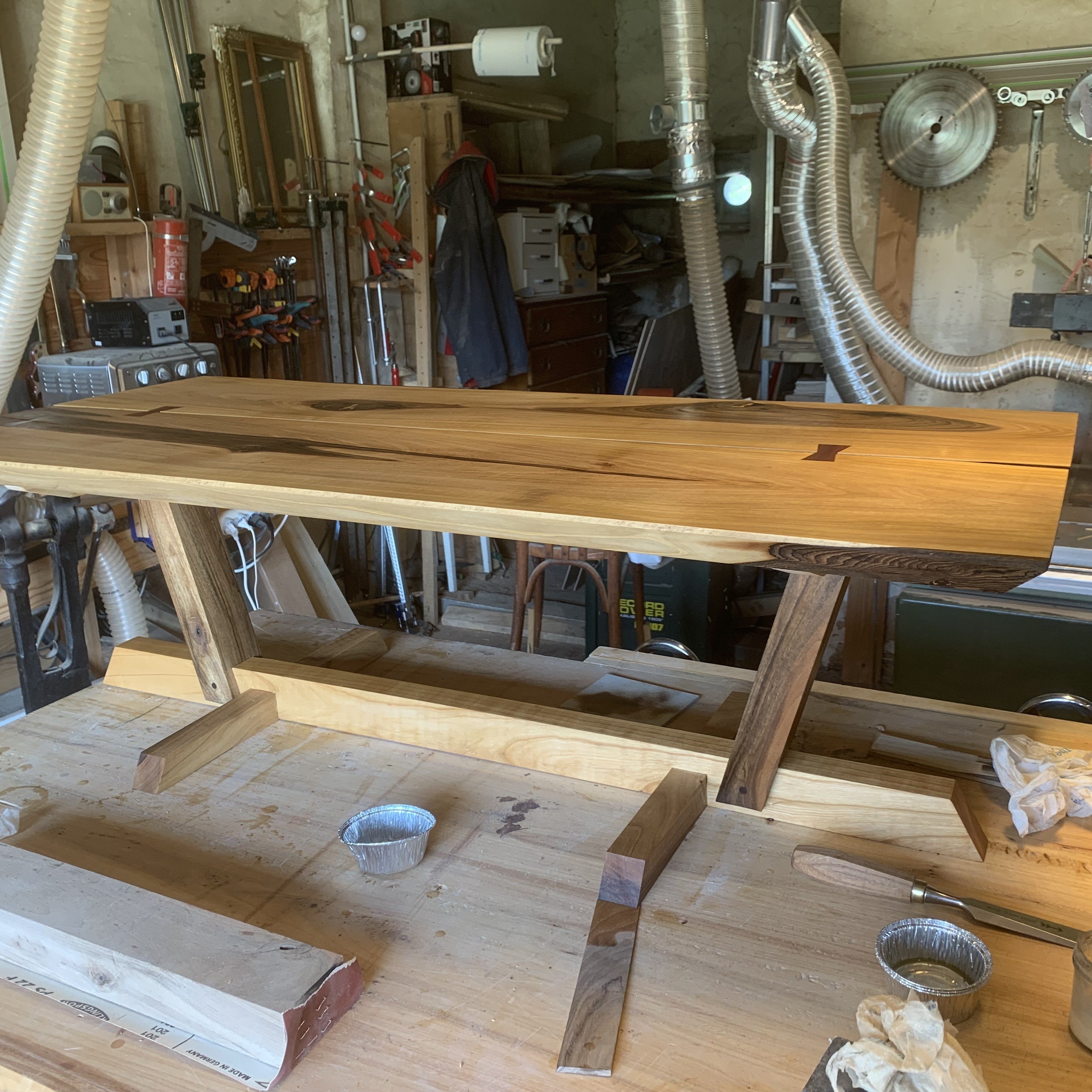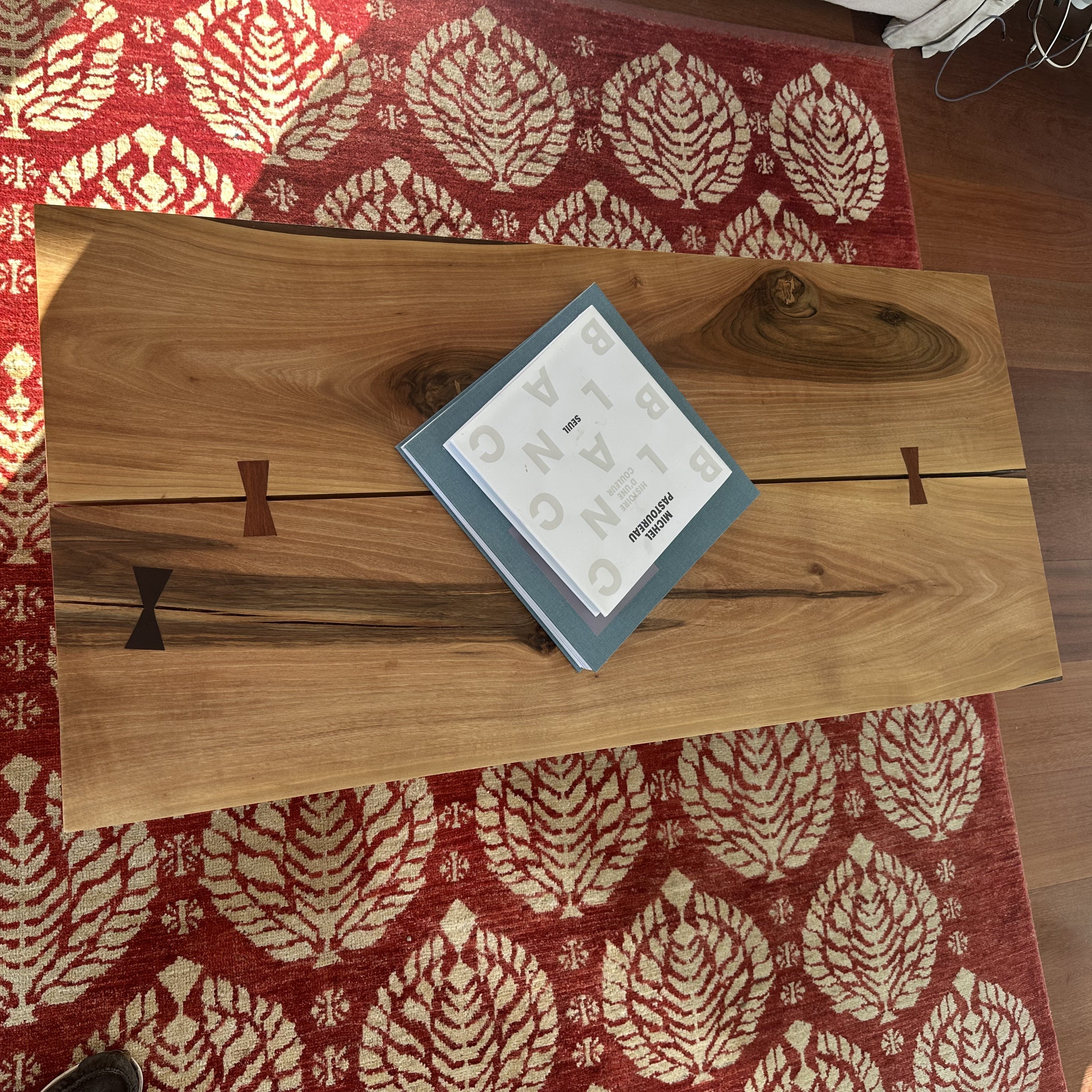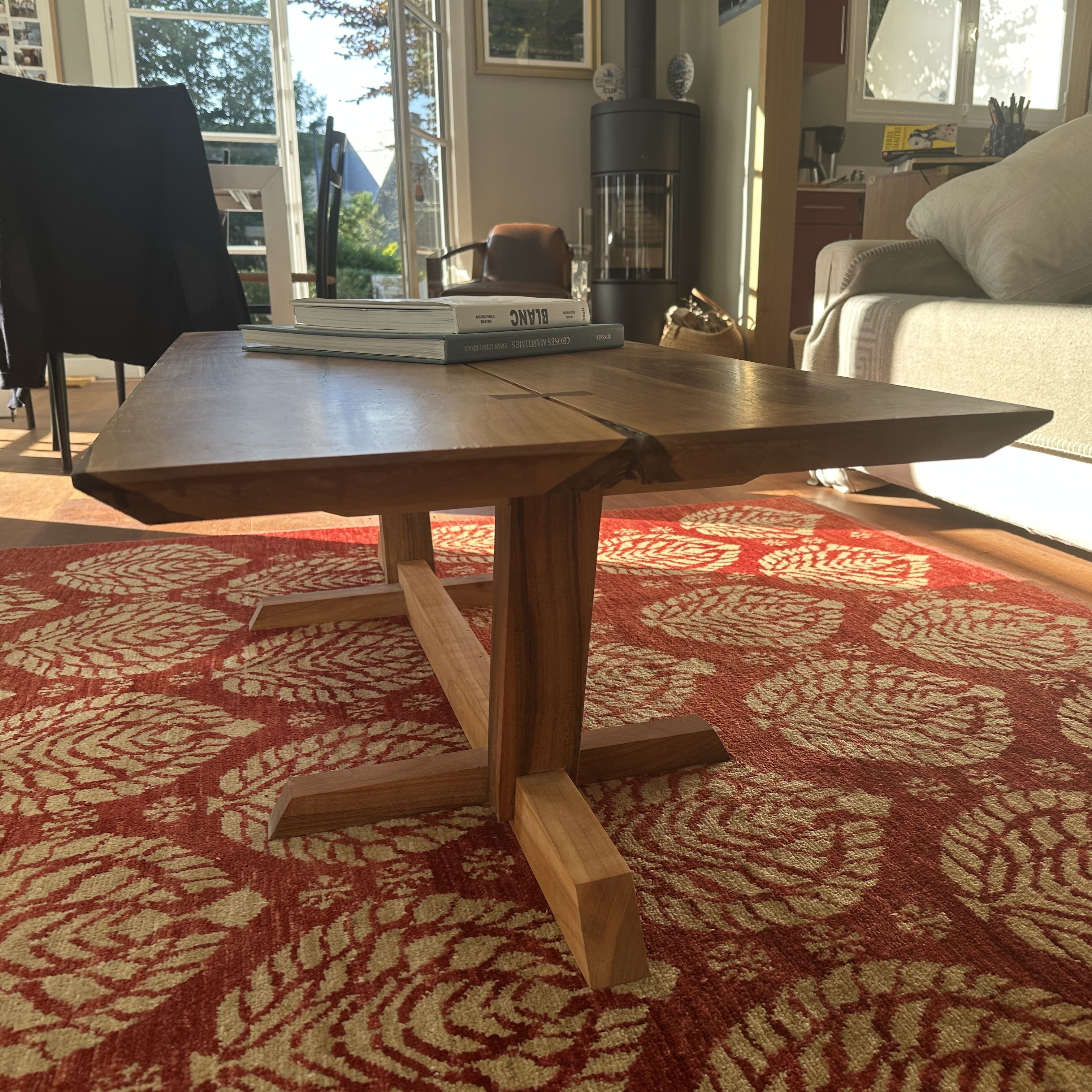 Noyer massif du Périgord, plateau 40mm avec chants biseautés à 45°, papillons de structure en bois de rose et ébène.